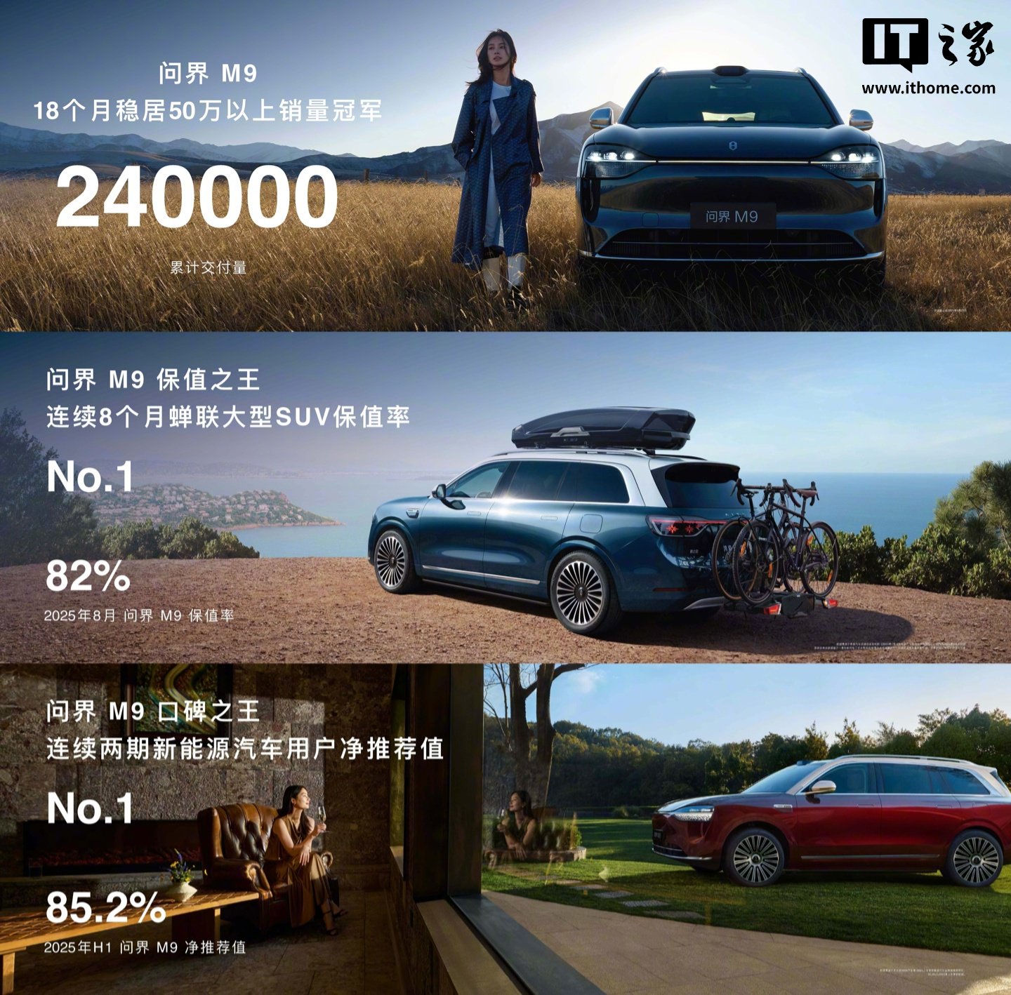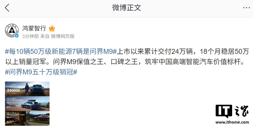 IT之家 9 月 23 日消息,鸿蒙智行官方微博今日宣布:每 10 辆 50 万级新能源 7 辆是问界 M9。据介绍,问界 M9 上市以来累计交付 24 万辆,18 个月稳居 50 万以上销量冠军。