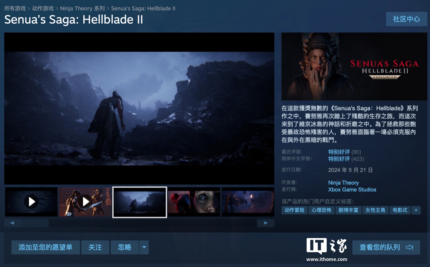 IT之家 9 月 23 日消息,微软第一方游戏《地狱之刃 2:塞娜的传说(Senua's Saga Hellblade 2)》现已在 Steam 平台迎来 3.5 折新史低,游戏原价 248 元,现 3.5 折售价 86.8 元,优惠将于 9 月 30 日结束,IT之家附 Steam 商品页。