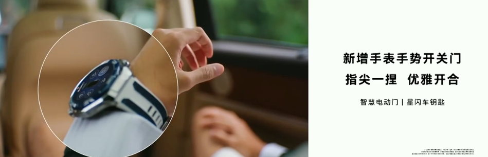 该车还新增手表手势开关门功能,用户捏合指尖,即可实现开关门。