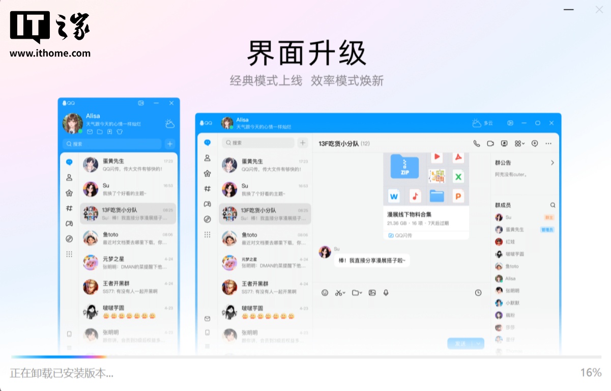 如图所示,新版本上线了“经典模式”,并对效率模式进行了更新,两种模式可自由切换。除此之外,新版本还支持合并独立聊天窗口。