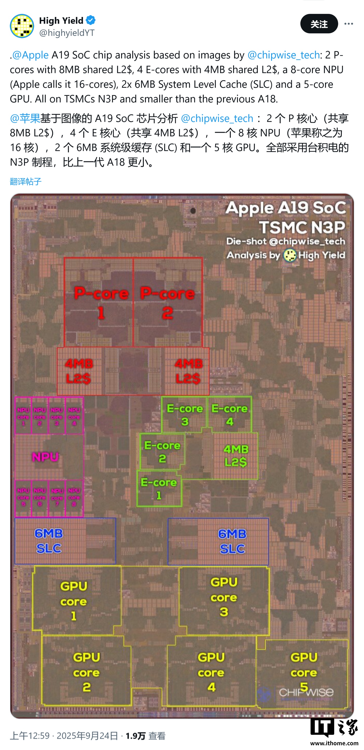 苹果 A19 芯片正面图,图源:chipwiseIT之家查询公开指令,消息源 @highyieldYT 分析该图片后认为,苹果 A19 芯片共有 2 个 P 核心(共享 8MB L2$),4 个 E 核心(共享 4MB L2$),一个 8 核 NPU(苹果称之为 16 核),2 个 6MB 系统级缓存(SLC)和一个 5 核 GPU。