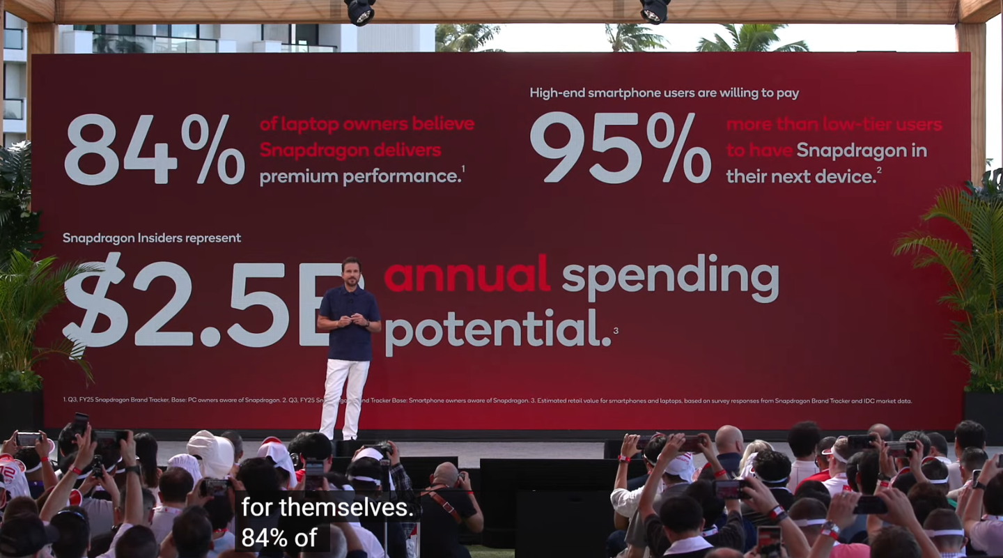 McGuire 还表示高通骁龙品牌已成为全球颇具影响力品牌,调查显示 84% 的消费者认为骁龙笔记本具备卓越性能,95% 的用户愿意为搭载骁龙芯片的高端手机溢价,此外 Snapdragon Insiders 数量超过 2000 万。IT之家附上相关截图如下:
