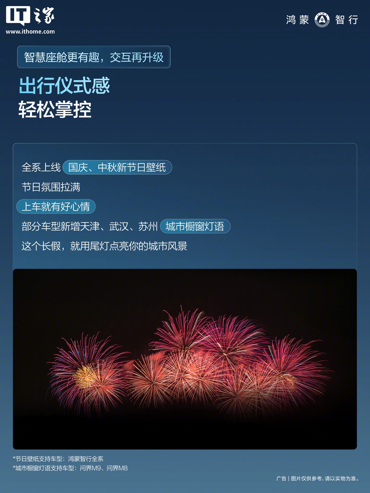 全系上线国庆、中秋新节日壁纸,部分车型新增天津、武汉、苏州城市橱窗灯语(节日壁纸支持车型:鸿蒙智行全系;城市橱窗灯语支持车型:问界 M9、问界 M8)