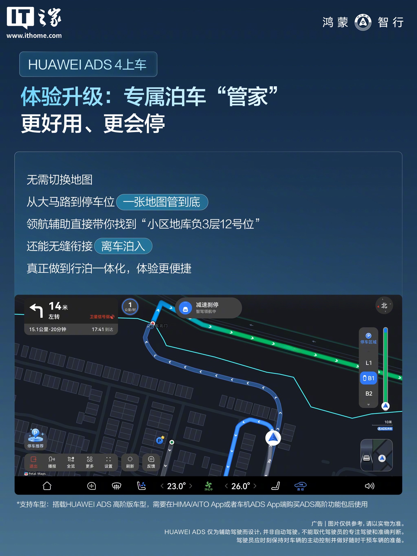 专属泊车“管家”:无需切换地图,从大马路到停车位一张地图管到底,还能无缝衔接离车泊入(搭载 HUAWEI ADS 高阶版车型,需要在 HIMA / AITO App 或者车机 ADS App 端购买 ADS 高阶功能包后使用)。