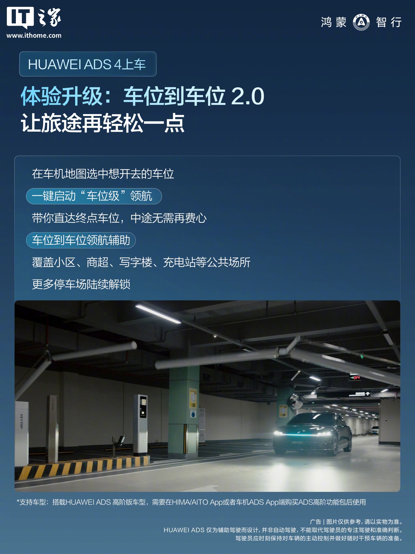 车位到车位 2.0,支持一键启动“车位级”领航、支持车位到车位领航辅助(搭载 HUAWEI ADS 高阶版车型,需要在 HIMA / AITO App 或者车机 ADS App 端购买 ADS 高阶功能包后使用)。