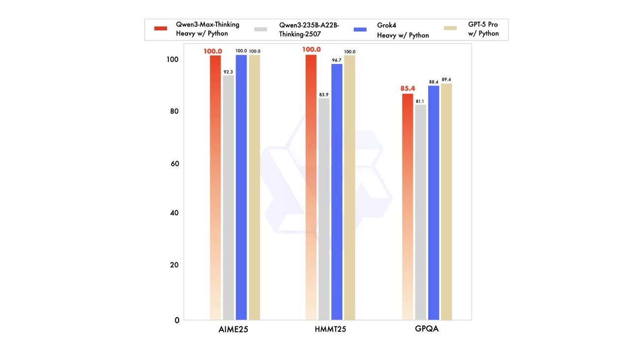 Qwen3-Max 的推理增强版本 —— Qwen3-Max-Thinking,通过集成代码解释器并运用并行测试时计算技术,展现了前所未有的推理能力,尤其在极具挑战性的数学推理基准测试 AIME 25 和 HMMT 上,均取得了满分。