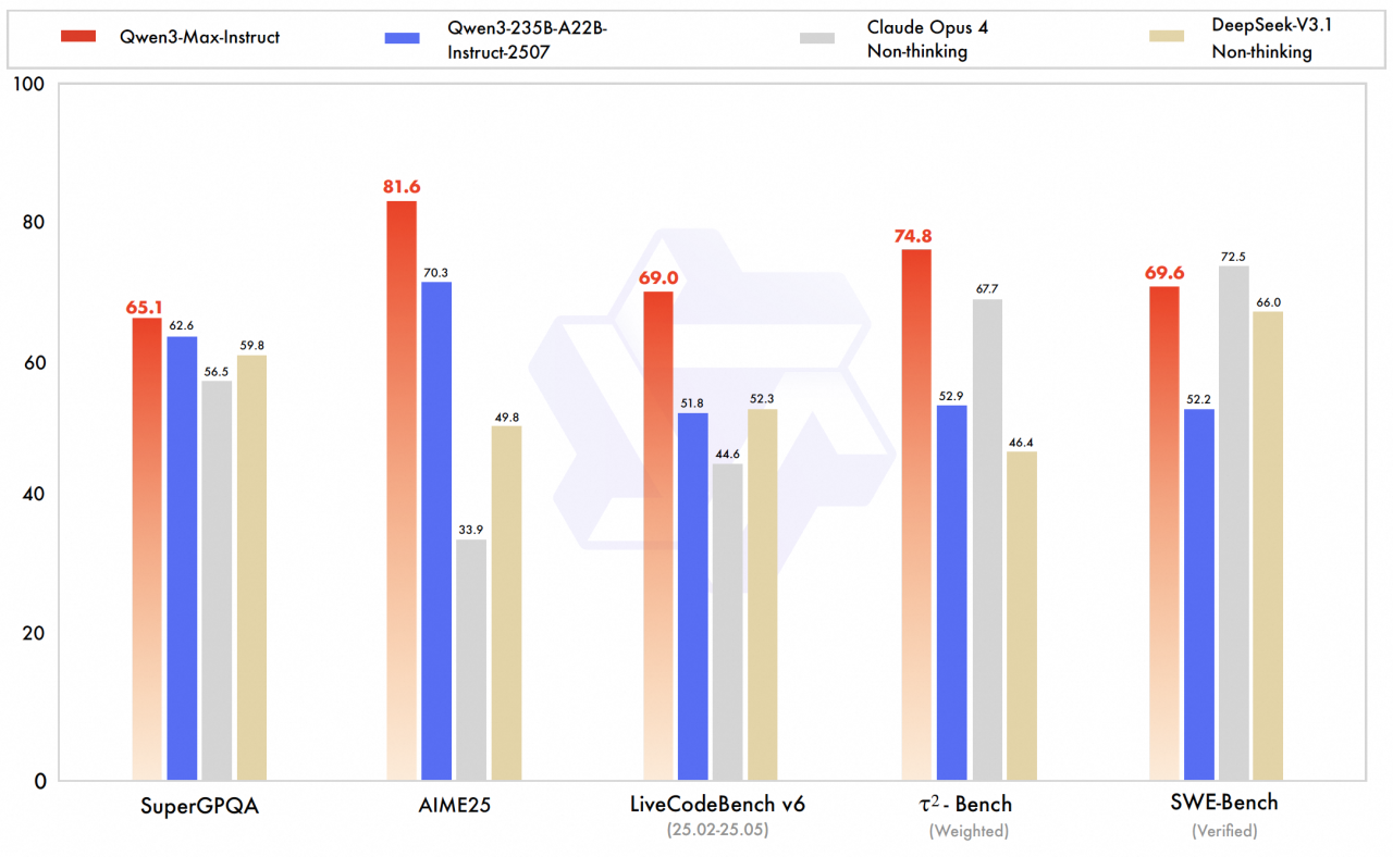 此外,在评估智能体工具调用能力的严苛基准 Tau2-Bench 上,Qwen3-Max-Instruct 更是实现了突破性表现,以 74.8 分超越 Claude Opus 4 与 DeepSeek-V3.1。