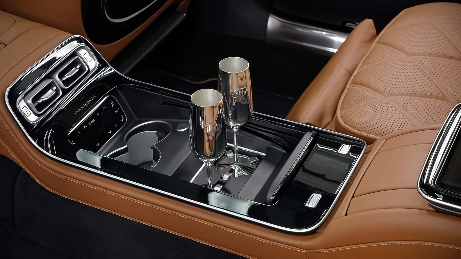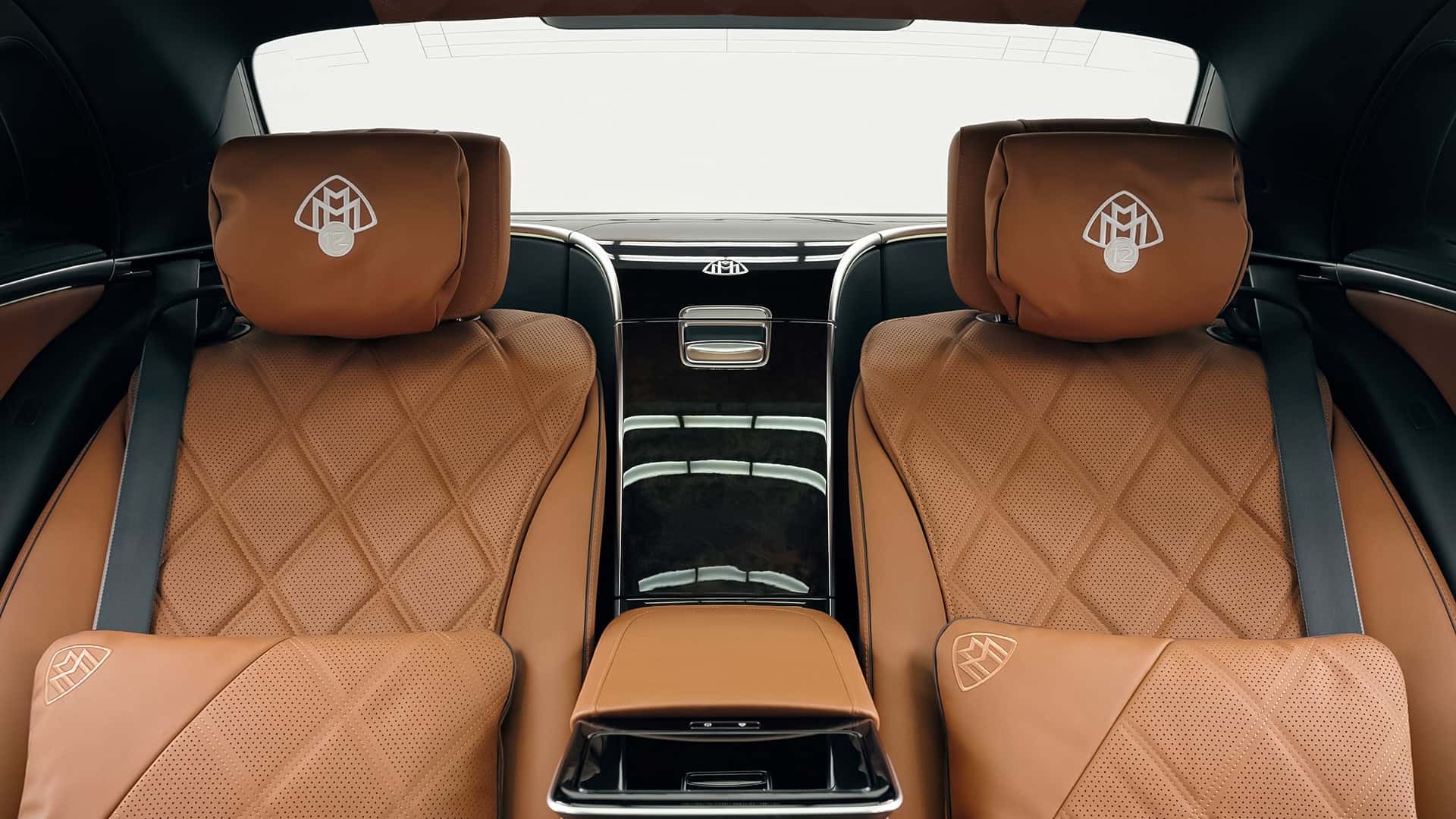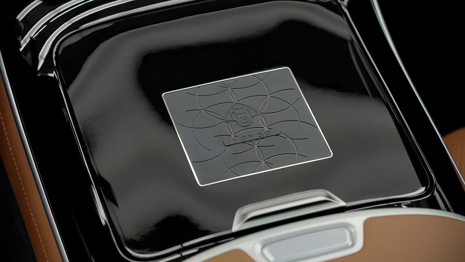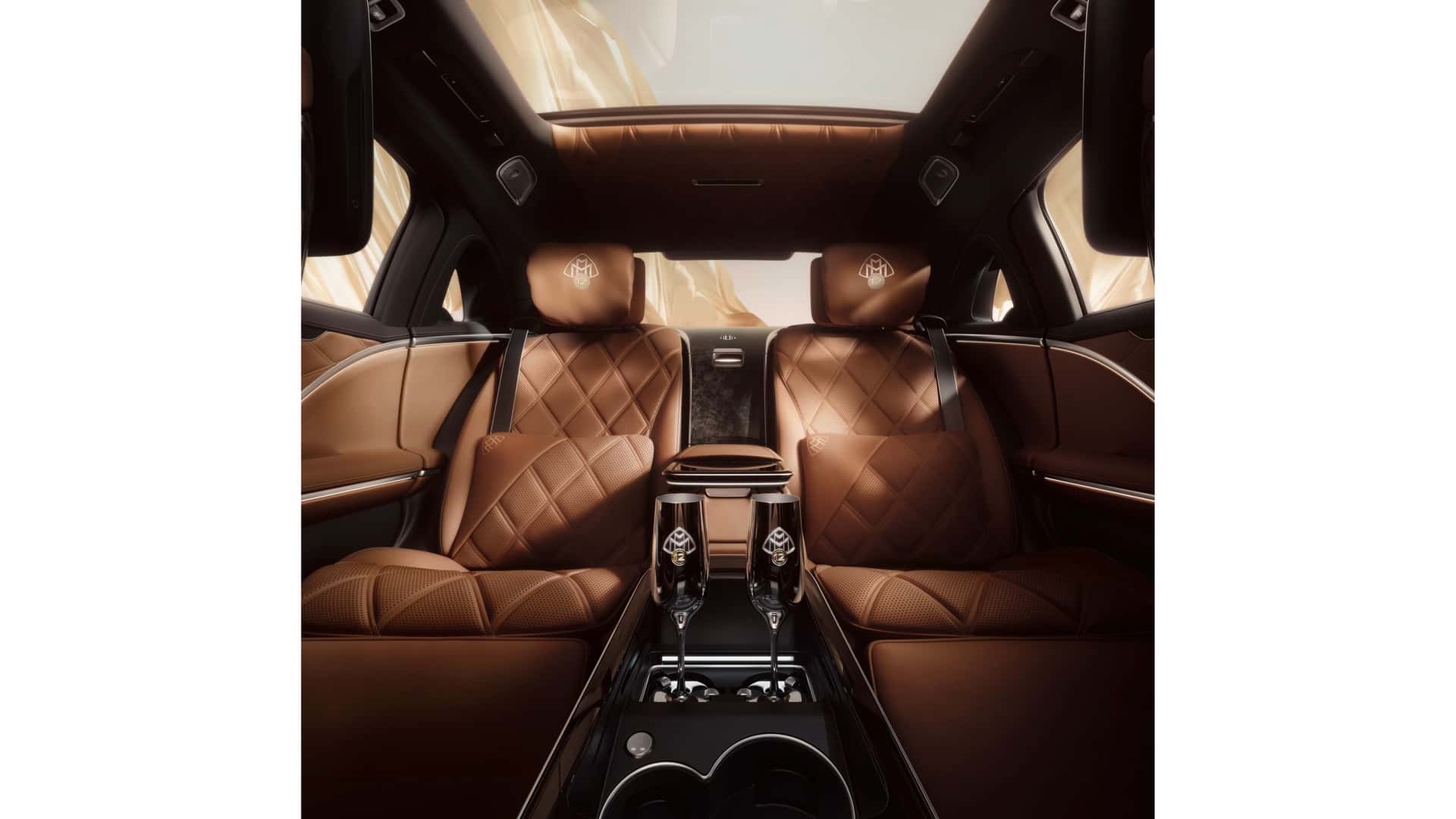 内饰方面,梅赛德斯极尽奢华之能事:车顶内衬采用菱形绗缝的鞍棕色皮革包裹,与座椅风格相呼应。胡桃木饰板延伸至方向盘,中央扶手处则配有“1 of 50”专属徽章,彰显其全球限量 50 台的稀有身份。后排中央扶手更是别具匠心,嵌入一片纯金饰板,制作耗时长达七天。