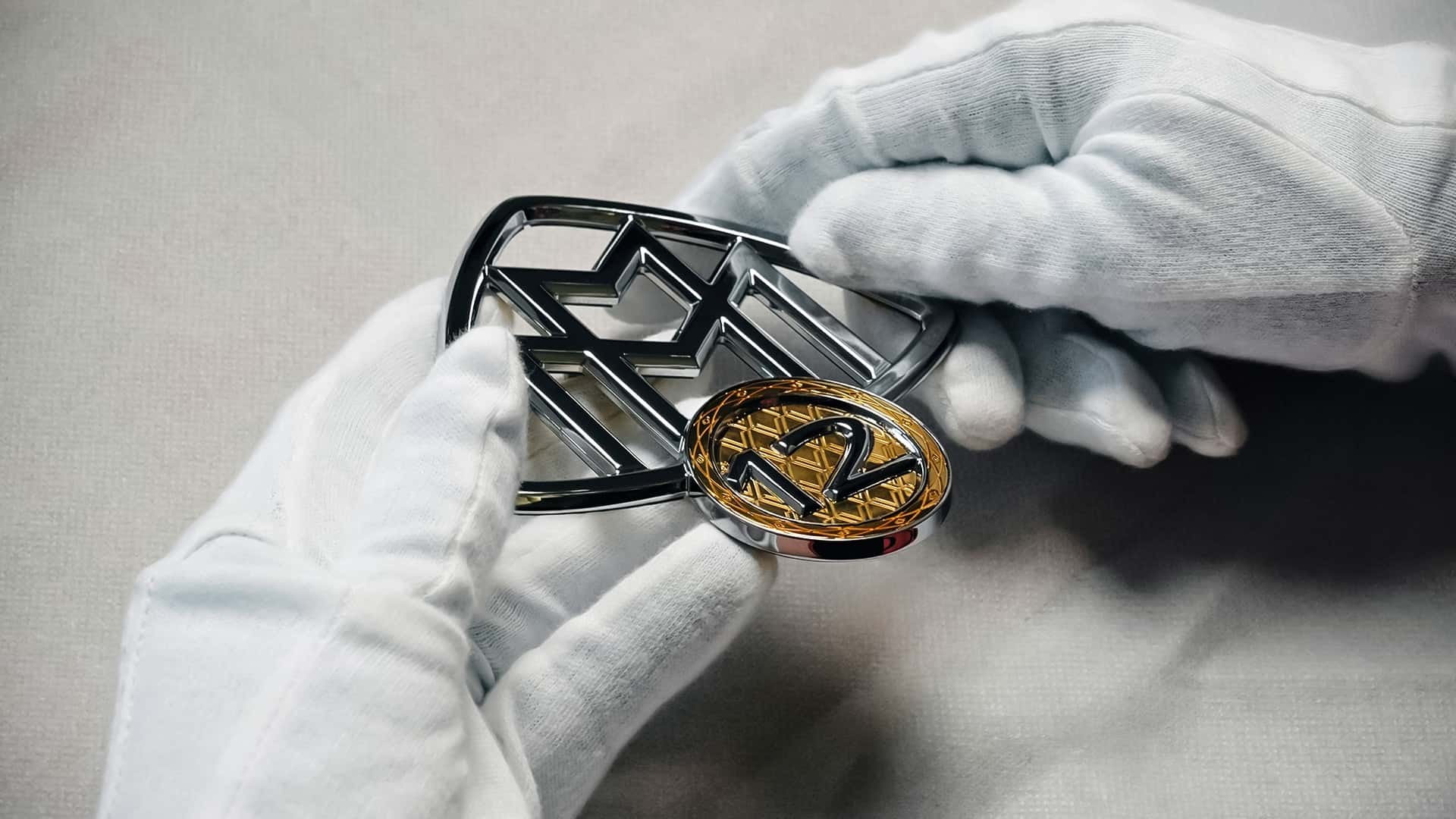 此次推出的梅赛德斯-迈巴赫 S680 特别版在奢华程度上更进一步,整车内外均加入了真金装饰。C 柱上的标志性双 M 徽标旁,新增一枚镶嵌钻石铭文的 24K 纯金纪念徽章。仔细观察还可发现点缀各处的微小“V”形标识,巧妙呼应了发动机舱内气缸的 V 型布局。