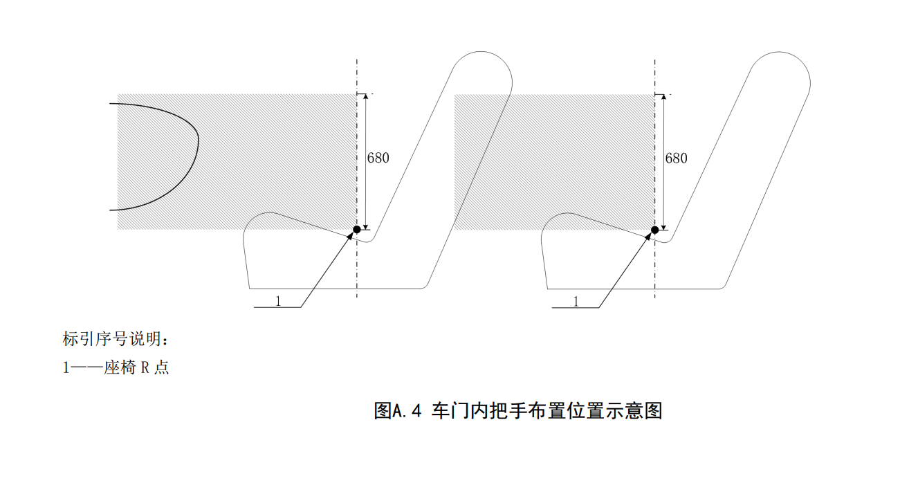 安装在每个车门邻近的外侧座椅 R 点前方,且 R 点上方 0 mm 至 680 mm 区域内,车门内把手布置示意图如图 A.4 所示;