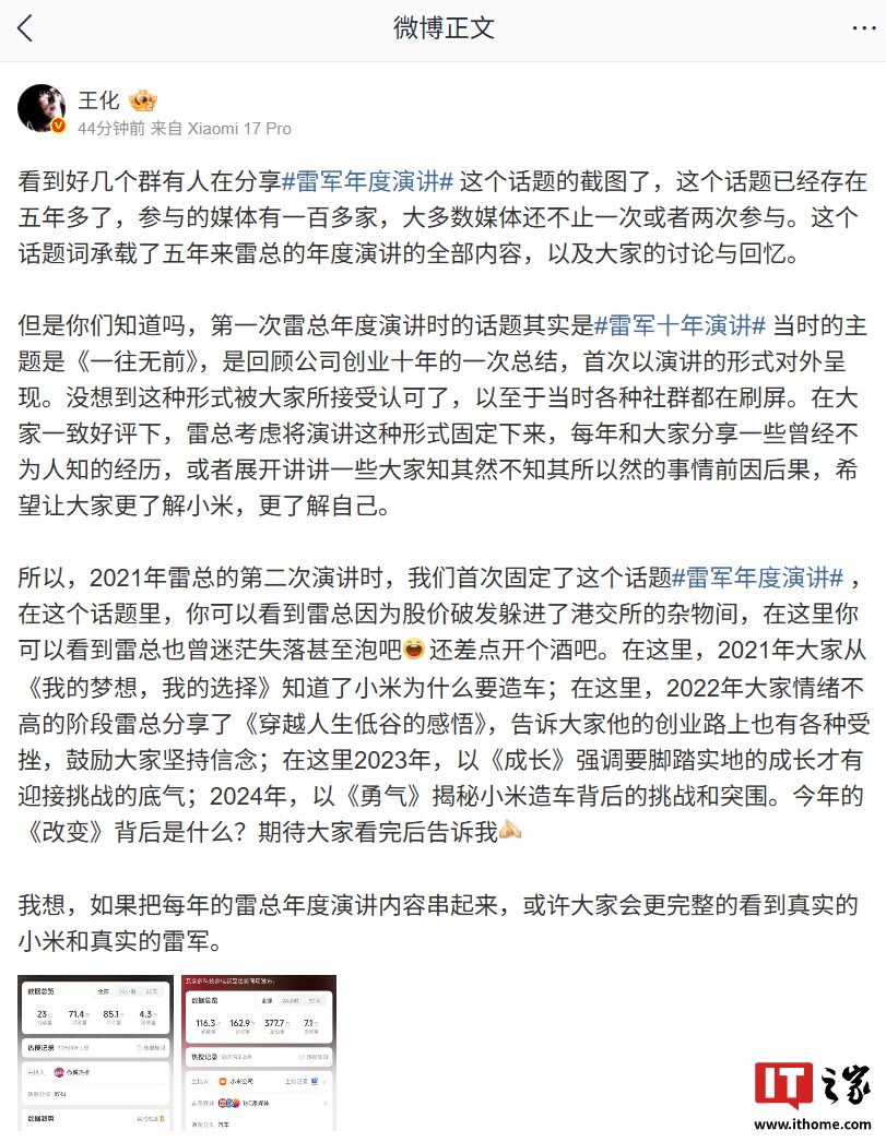 ▲ 图源:小米公关负责人王化微博(后同)王化表示,第一次雷总年度演讲时的话题其实是“雷军十年演讲”,当时的主题是《一往无前》,是回顾公司创业十年的一次总结,首次以演讲的形式对外呈现。在大家一致好评下,雷总考虑将演讲这种形式固定下来。所以,2021 年雷总的第二次演讲时,我们首次固定了这个话题“雷军年度演讲”。
