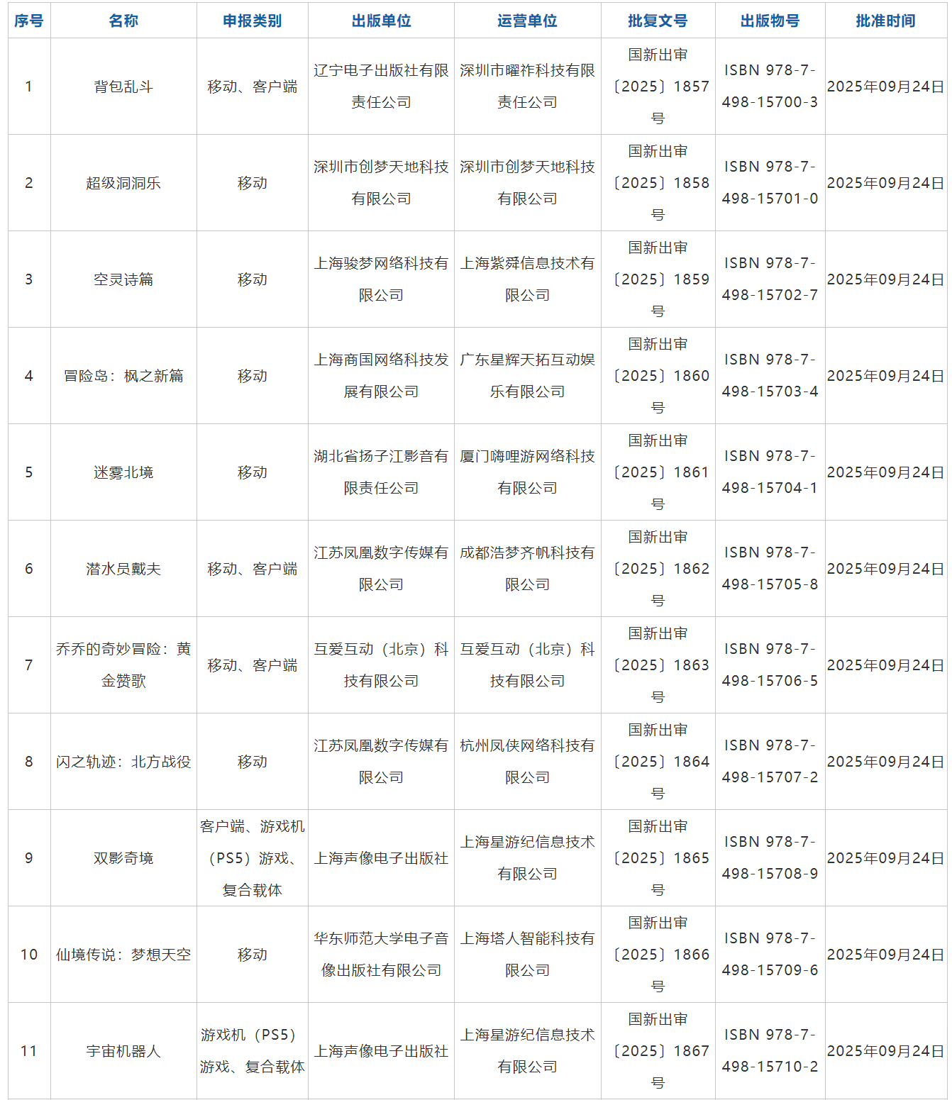 IT之家 9 月 24 日消息,国家新闻出版署今日公布了 2025 年 9 月的进口网络游戏审批信息,《双影奇境》《宇宙机器人》《潜水员戴夫》等 11 款进口游戏获批版号。IT之家附名单如下: