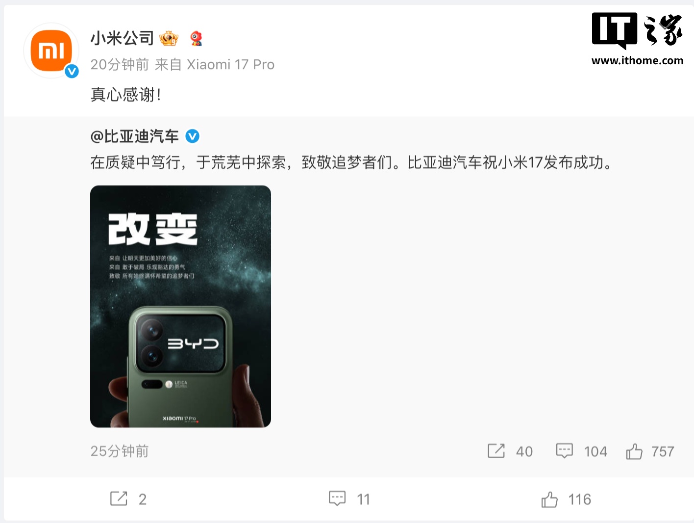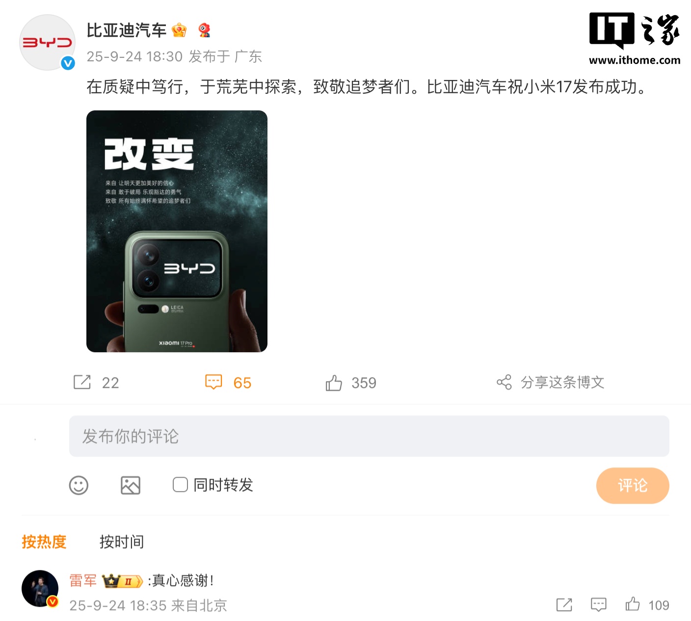 IT之家 9 月 24 日消息,今天傍晚,比亚迪汽车官微发文:“在质疑中笃行,于荒芜中探索,致敬追梦者们。比亚迪汽车祝小米 17 发布成功。”