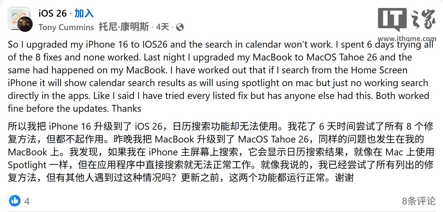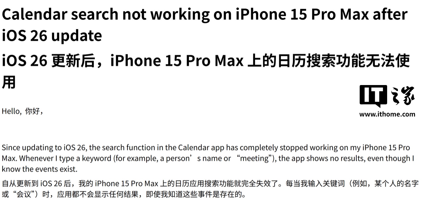 IT之家 9 月 25 日消息,科技媒体 MacRumors 昨日(9 月 24 日)发布博文,报道称部分 iPhone 用户反馈,升级到 iOS 26 系统后,遇到日历 App 搜索失效问题,影响机型涵盖 iPhone 13 mini 到 iPhone 17 Pro。