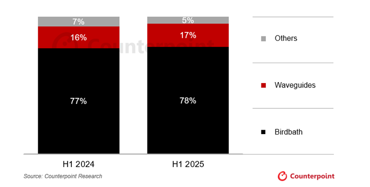 按细分市场来看,基于 Birdbath 方案、以视频为中心的 AR 智能眼镜仍然占据主导地位,占出货量的 78%,其次是基于光波导(waveguide)、以信息显示为主的 AR 智能眼镜,占比约 17%。2025 年上半年基于波导的 AR 智能眼镜的平均售价(ASP)比更成熟的基于 Birdbath 的产品高出约 27%。