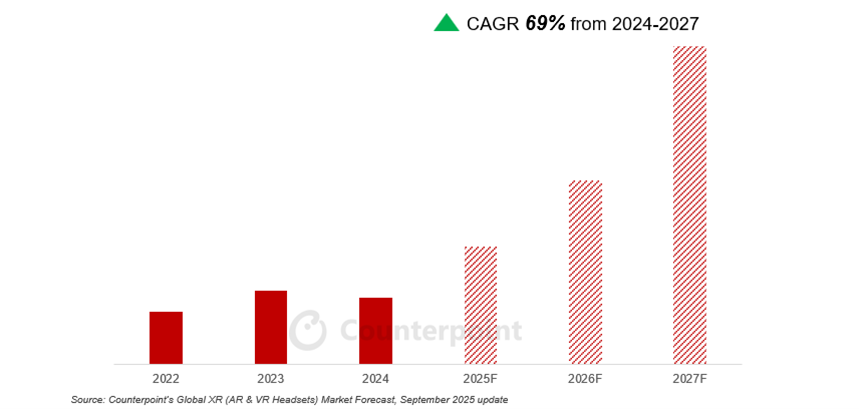 IT之家 9 月 25 日消息,市场调查机构 CounterPoint Research 今天(9 月 25 日)发布博文,报告称 2025 年上半年全球虚拟现实(VR)头戴设备出货量同比下降 14%,增强现实(AR)智能眼镜同比增长 50%。