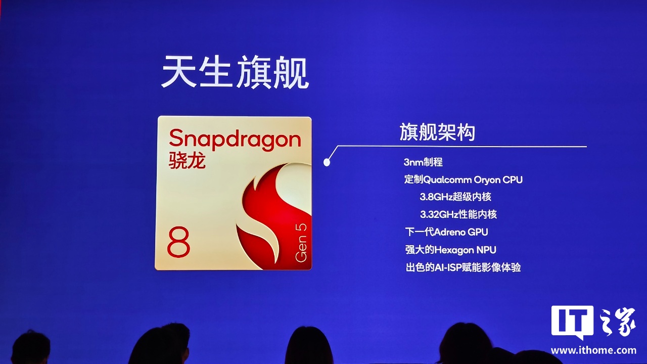 IT之家在 2025 骁龙峰会现场获悉,「第五代骁龙 8」处理器采用 3nm 制程,定制 Qualcomm Oryon CPU,拥有 3.8GHz 超级内核 + 3.32GHz 性能内核,并采用下一代 Adreno GPU + Hexagon NPU,可提供 AI-ISP 赋能影像体验。