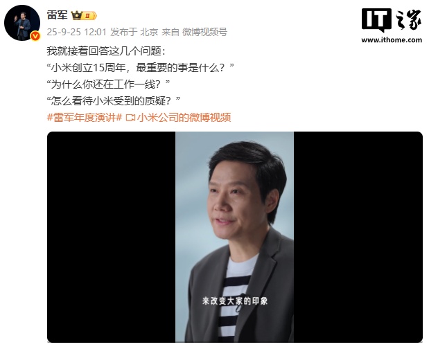 IT之家 9 月 25 日消息,小米创始人雷军今日发布视频,回应了“小米创立 15 周年,最重要的事是什么?”“为什么你还在工作一线?”“怎么看待小米受到的质疑?”等问题。