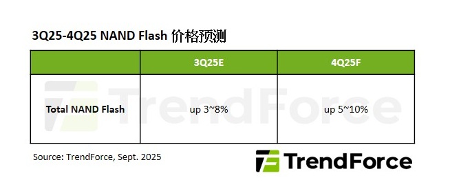 IT之家 9 月 25 日消息,TrendForce 集邦咨询今日表示,AI 服务器市场对大容量 QLC 企业级固态硬盘的需求大幅攀升,让原本预计会进入一段盘整期的 NAND 闪存价格重新进入上升轨道,预计今年四季度 NAND 平均合约价将出现 5~10% 的环比涨幅。