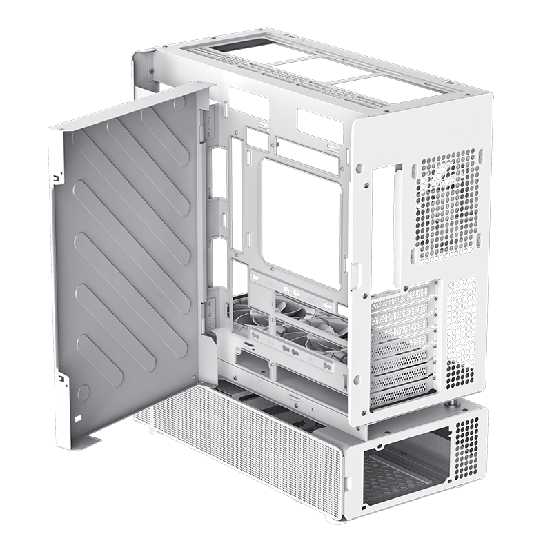 该机箱预装 6 颗 Tornado T12 ARGB 风扇,其中尾部 1 颗为正叶版本、右侧 2 颗与上舱底部 3 颗为反叶版本。其 I/O 面板位于底仓左侧前部,提供了 1 个 USB 10Gbps、1 个 USB-A 5Gbps、1 个二合一音频插孔。