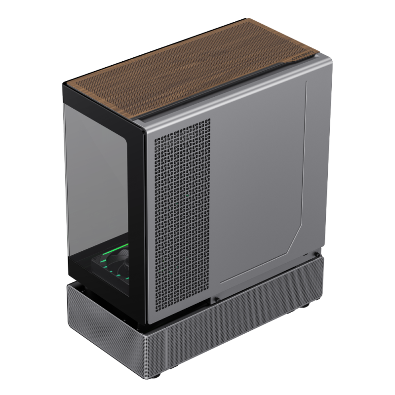 其上下舱之间挖空增强显卡散热、左前两面为曲面玻璃无柱结构、下舱后方包含一个 64×8 灯显矩阵、顶部的 MESH 网板采用胡桃木纹装饰、右侧板下方的铰链式盖板优化了线材管理。
