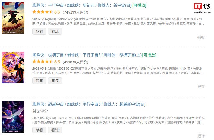 《蜘蛛侠:平行宇宙》于 2018 年 12 月 21 日在中国大陆上映,曾获得包括奥斯卡金像奖最佳动画长片在内的二十多项大奖。续集《蜘蛛侠:纵横宇宙》于 2023 年 6 月 2 日在中国大陆上映。截至IT之家发文,两部电影豆瓣评分分别为 8.6 和 8.5。