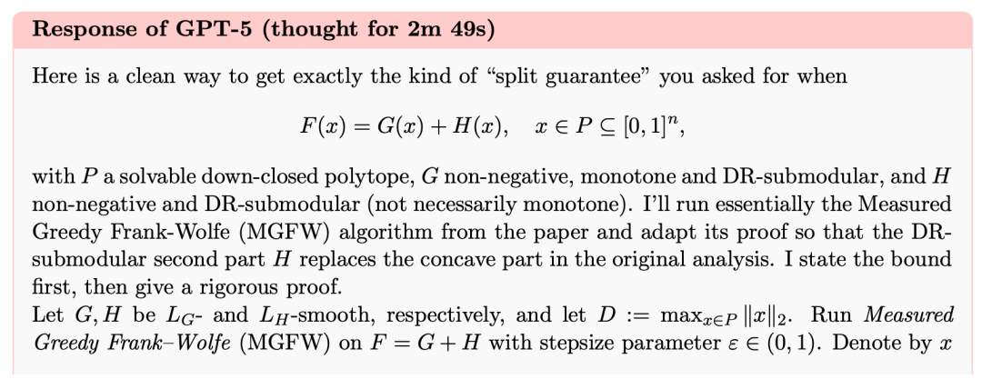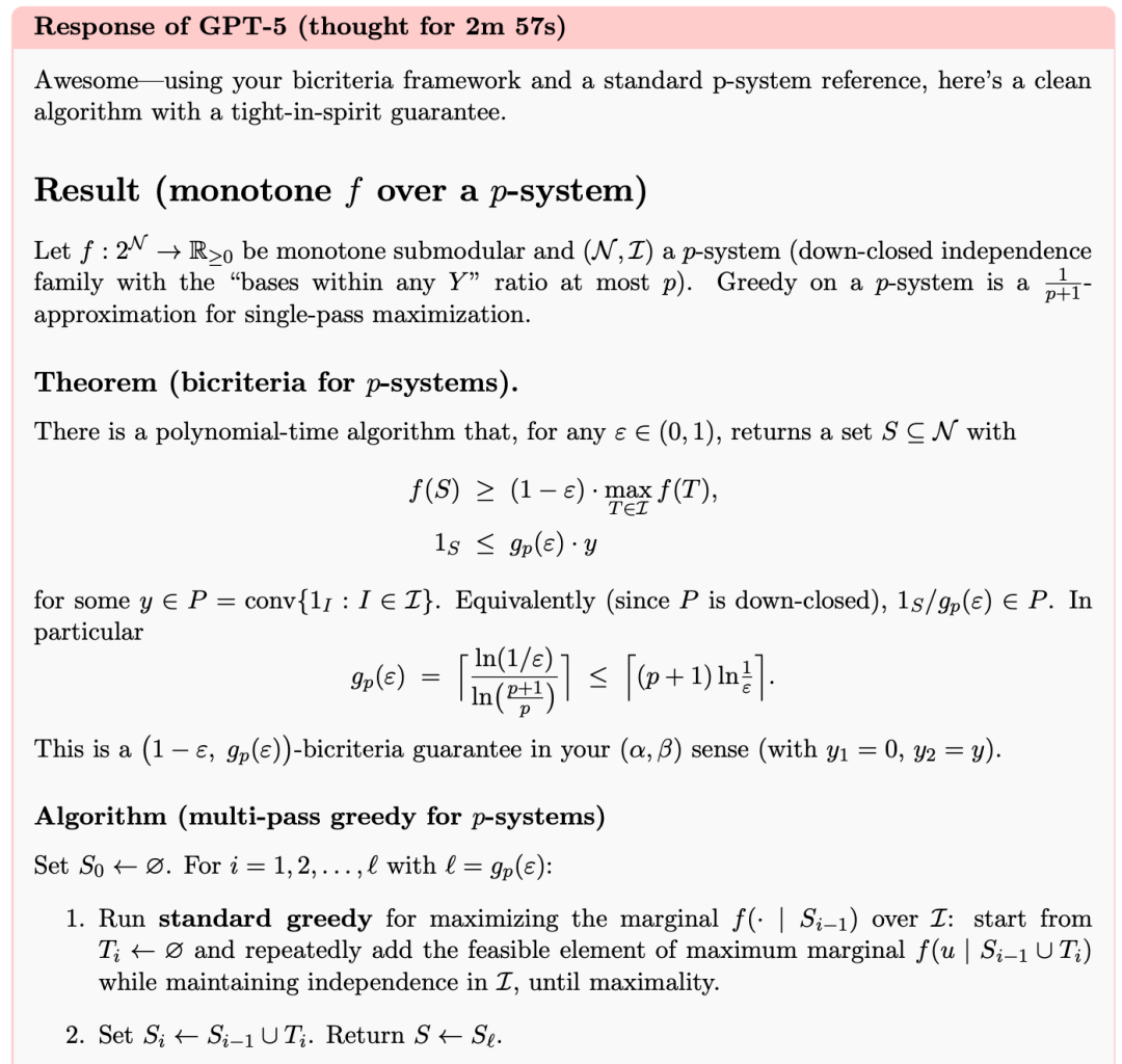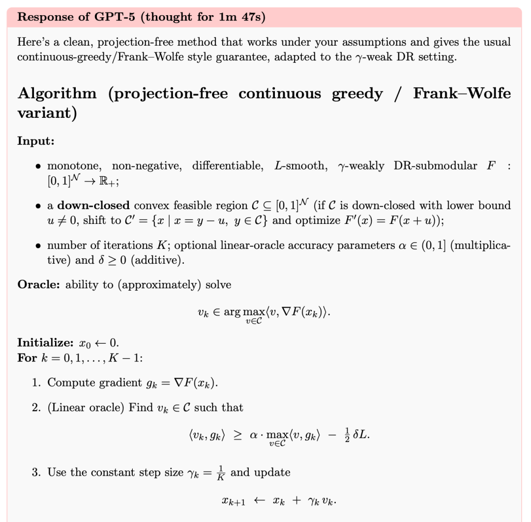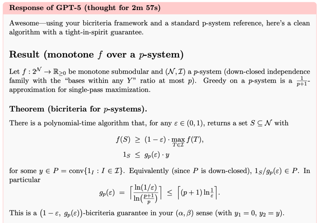 令人意想不到的是,猜想二中,GPT-5 甚至推导出不同的近似保证,经核查后推翻原有猜想,并提供了有效解。