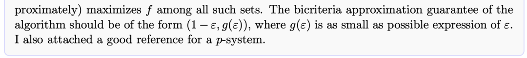 这题允许「价值几乎最优(1−ε)」,但在可行性上稍微超一点(放宽倍数 g (ε)),目标是在越广泛的 p-system 约束下把 g (ε) 压到尽量小。