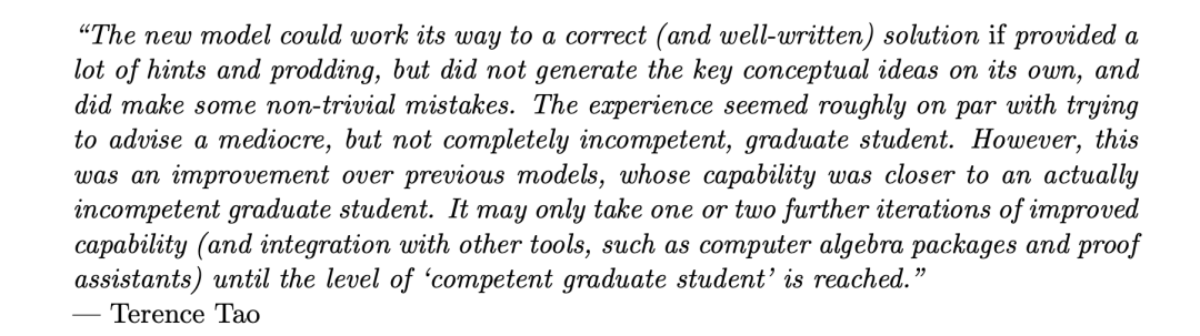 此前,陶哲轩曾分享了自己与 OpenAI o1 合作经验,生动地将其比作「指导一名平庸,但并非完全无能的研究生」。