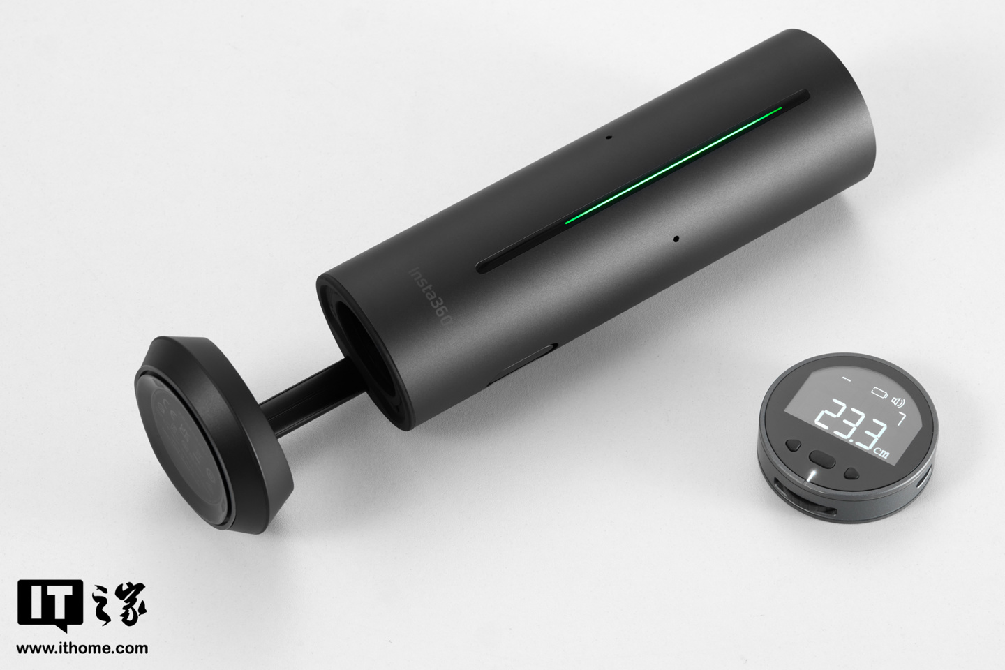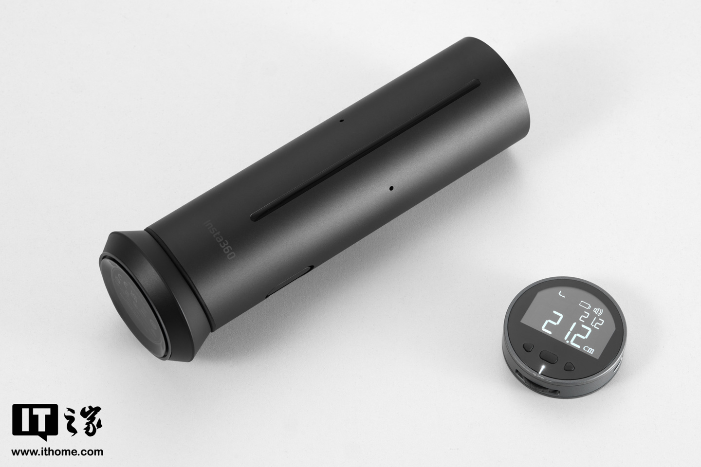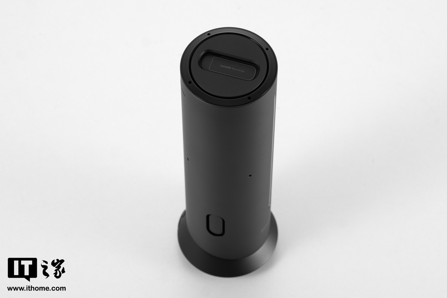 把收纳袋和配件放到一边,我们来看这款产品本身。IT之家拿到的是石墨黑配色,其整体造型简洁,实测直径为 52.6mm,重量为 492.2g,顶盖处收纳有 Insta360 Wave Dongle 无线收发器,相应收发器支持无线连接,即插即用。
