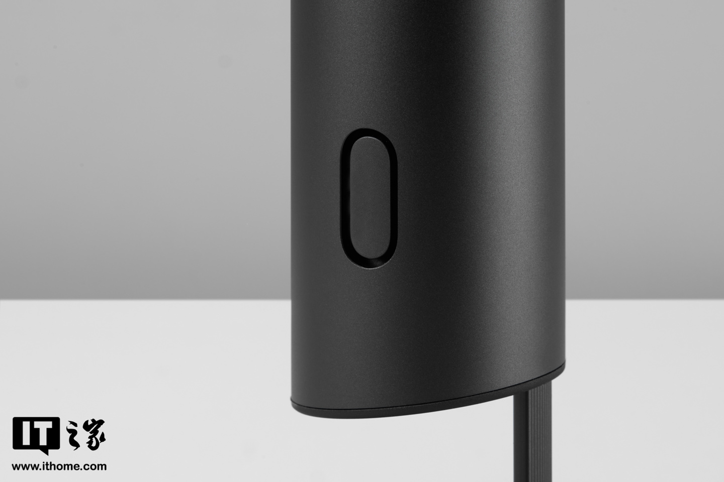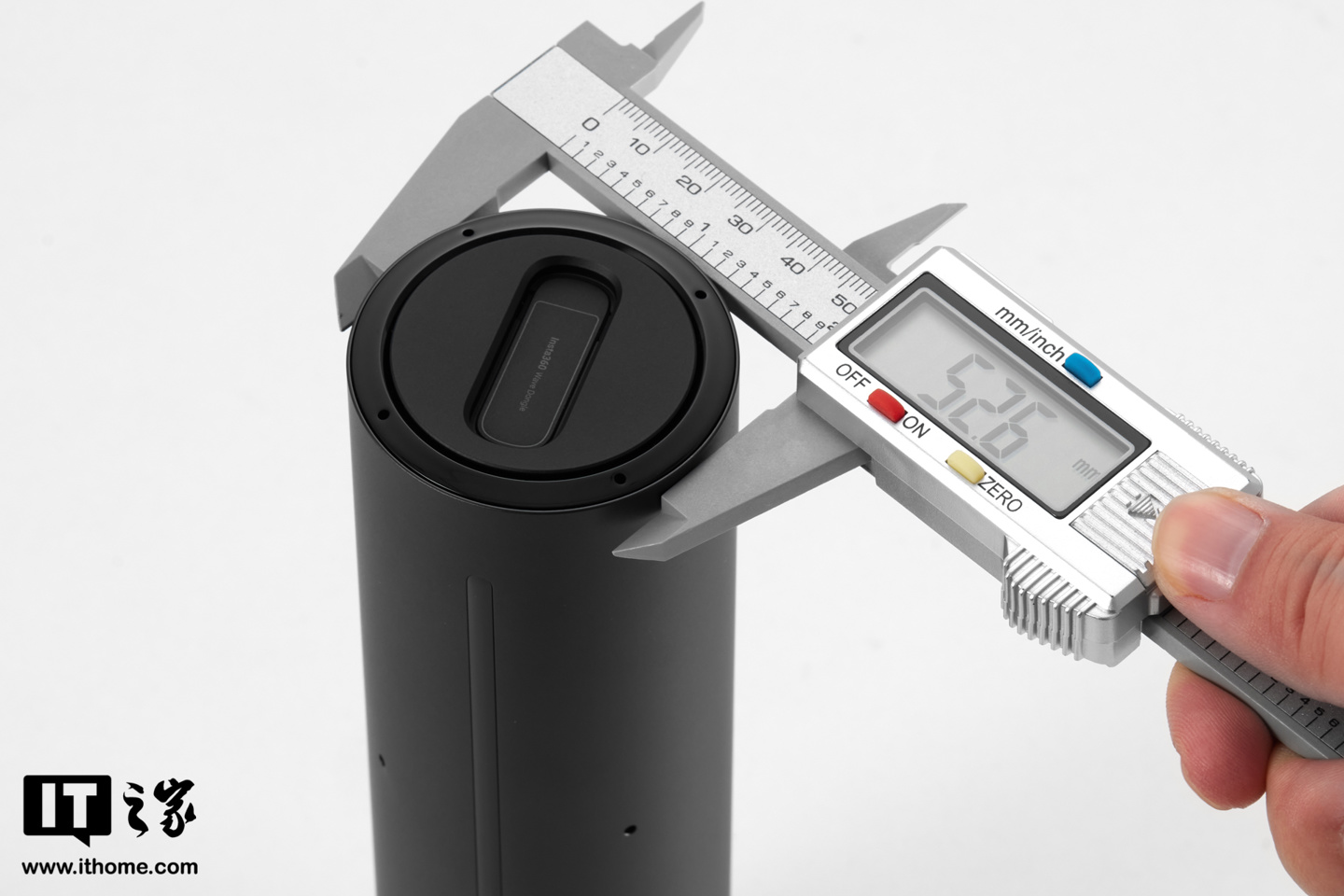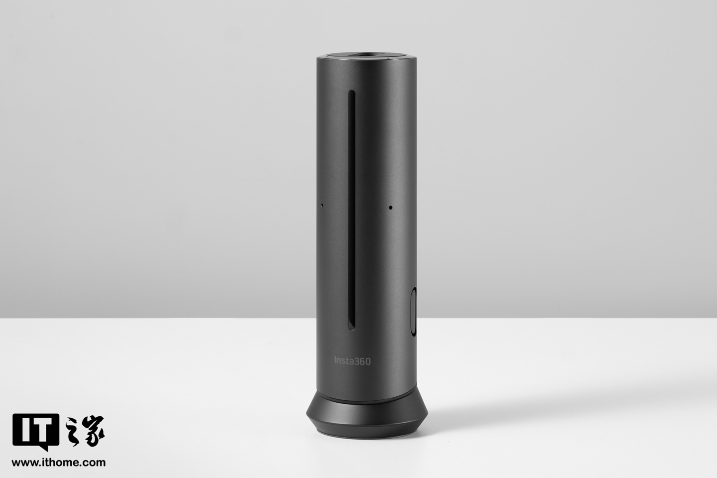 把收纳袋和配件放到一边,我们来看这款产品本身。IT之家拿到的是石墨黑配色,其整体造型简洁,实测直径为 52.6mm,重量为 492.2g,顶盖处收纳有 Insta360 Wave Dongle 无线收发器,相应收发器支持无线连接,即插即用。