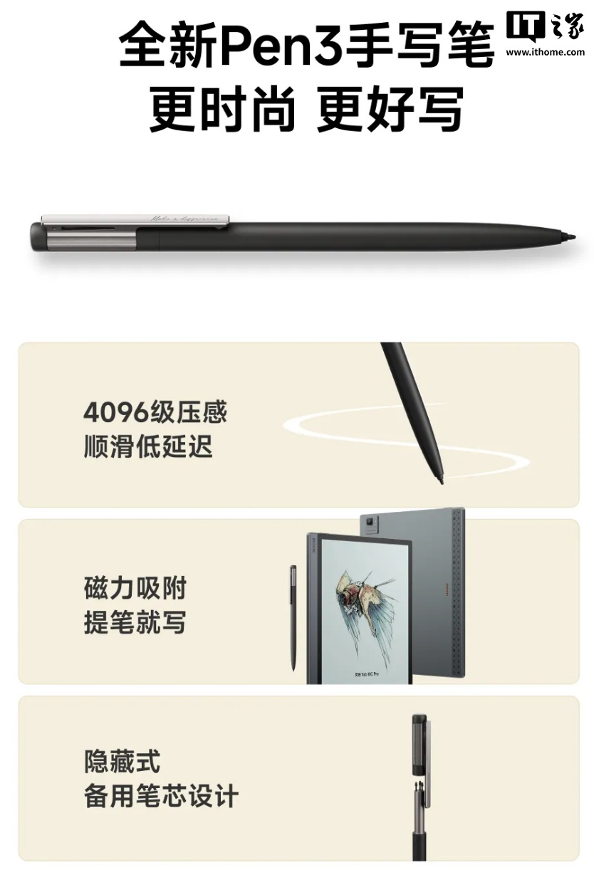 该机配有全新 Pen 3 手写笔,支持 4096 级压感、磁力吸附、隐藏式备用笔芯。