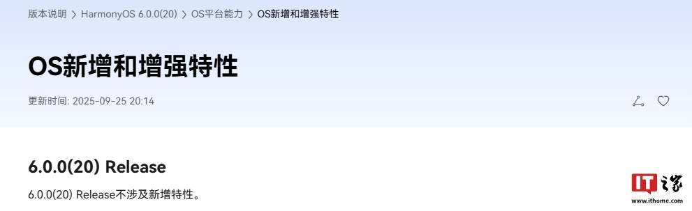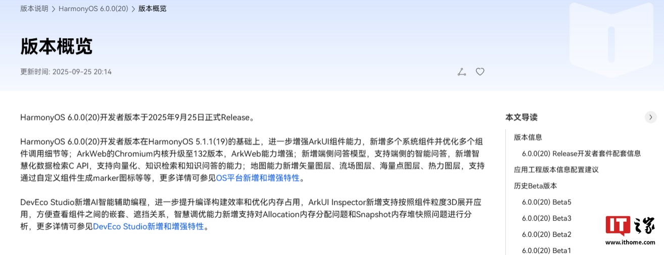 IT之家 9 月 25 日消息,华为开发者官网显示,鸿蒙 HarmonyOS 6.0.0 (20) 开发者版本今日(2025 年 9 月 25 日)正式 Release。需要注意的是,6.0.0 (20) Release 不涉及新增特性。这意味着 HarmonyOS 6 系统迈入了更成熟的阶段,有望近期开启更大范围的测试。
