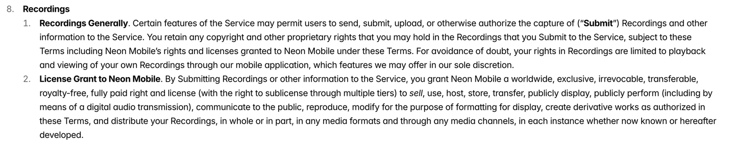 更令人担忧的是该应用的隐私政策细节。条款明确指出,即使用户从手机上删除了 Neon 应用,只要其账户没有被正式注销,在其他 Neon 用户呼叫他们时,通话内容仍可能被录制。
