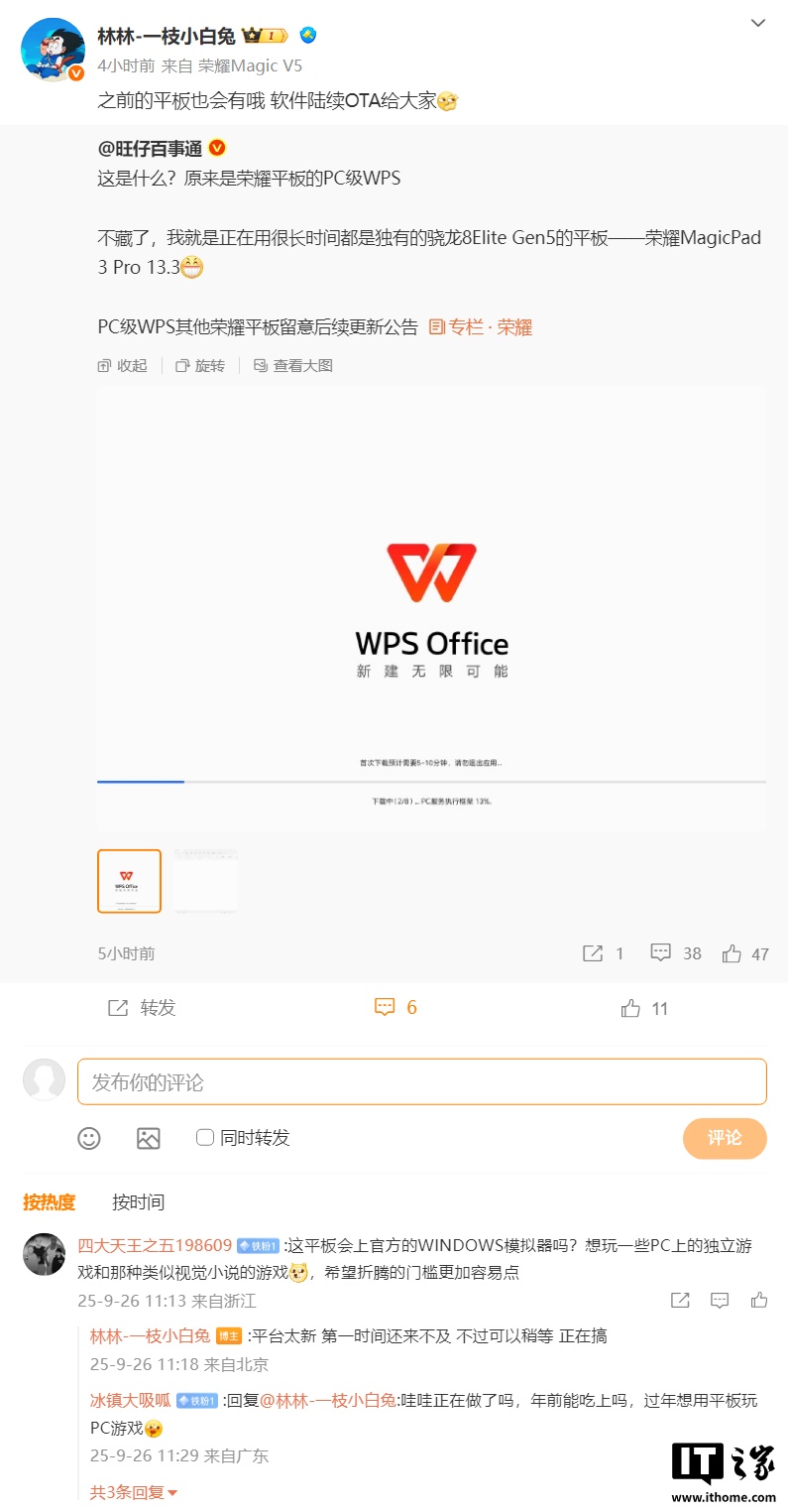 IT之家 9 月 26 日消息,博主 @旺仔百事通 今日晒出图片,搭载第五代骁龙 8 至尊版的荣耀 MagicPad 3 Pro 13.3 平板电脑可运行 PC 级 WPS Office 办公软件。