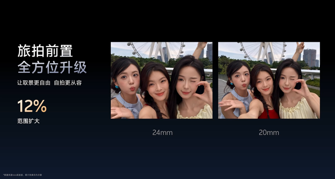 vivo X300 系列的前置摄像头搭载 50MP 传感器,焦段从 24mm 变为 20mm,视角更广,还搭载 vivo 自研 NICE 算法、GTR 质感人像算法。