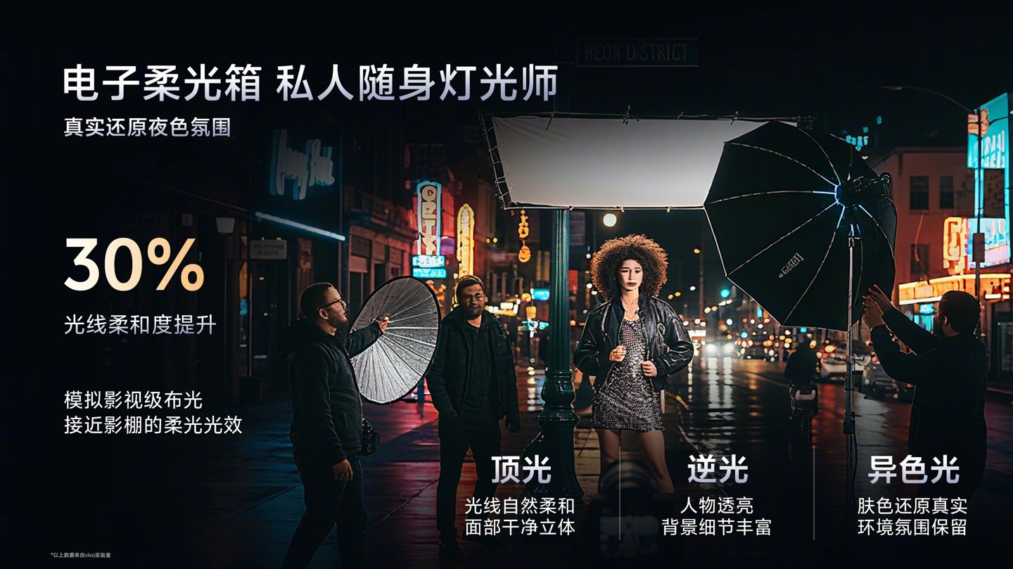 vivo X300 系列搭载全新设计的“电子柔光箱”算法,夜景的光线柔和度提升 30%。