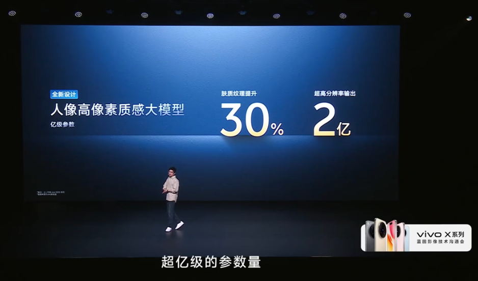 vivo X300 系列搭载 vivo 与联发科联合研发的人像高像素重建大模型,达亿级参数、30T 算力需求,人像模式支持全焦段 50MP 高像素。