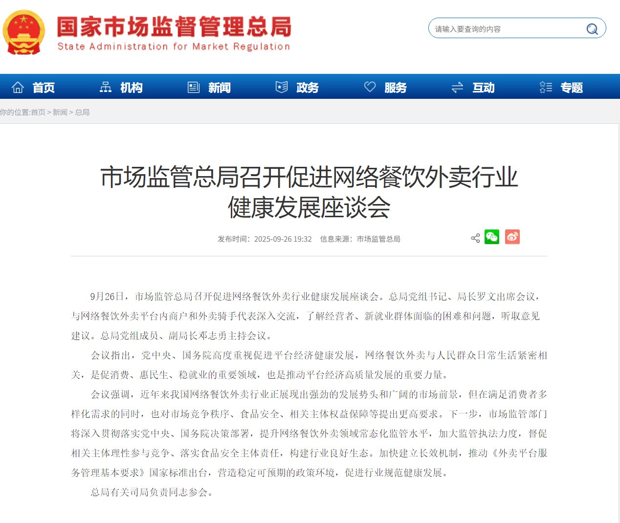 IT之家 9 月 26 日消息,国家市场监管总局官网今日发文,市场监管总局召开促进网络餐饮外卖行业健康发展座谈会。总局党组书记、局长罗文出席会议,与网络餐饮外卖平台内商户和外卖骑手代表深入交流,了解经营者、新就业群体面临的困难和问题,听取意见建议。总局党组成员、副局长邓志勇主持会议。