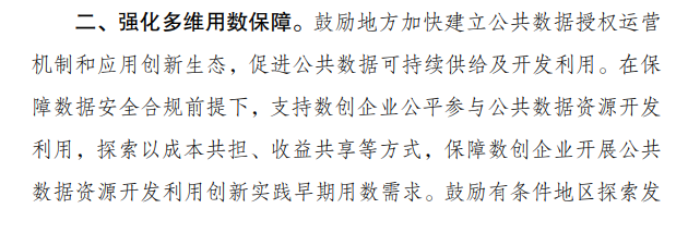 《措施》指出,有关部门将进一步鼓励地方加快建立公共数据授权运营机制和应用创新生态,促进公共数据可持续供给及开发利用。在保障数据安全合规前提下,支持数创企业公平参与公共数据资源开发利用,探索以成本共担、收益共享等方式,保障数创企业开展公共数据资源开发利用创新实践早期用数需求。