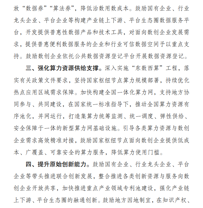 同时,相应部门鼓励有条件地区探索发放“数据券”“算法券”,降低治数用数成本。鼓励国有企业、行业龙头企业、平台企业等构建产业链上下游、平台生态圈数据服务平台,开发提供普惠性数据产品和技术工具,对面向数创企业发展需求,提供普惠便利数据服务的企业和行业可信数据空间予以重点支持。鼓励数创企业依托公共数据资源登记平台开展数据资源登记。