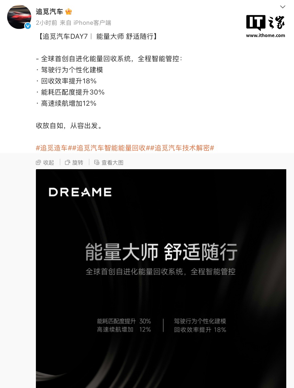 IT之家 9 月 26 日消息,追觅汽车官方微博发文,展示了“追觅汽车首款超奢旗舰 SUV”规格信息,该车定位于大型 SUV,将采用增程式动力系统。