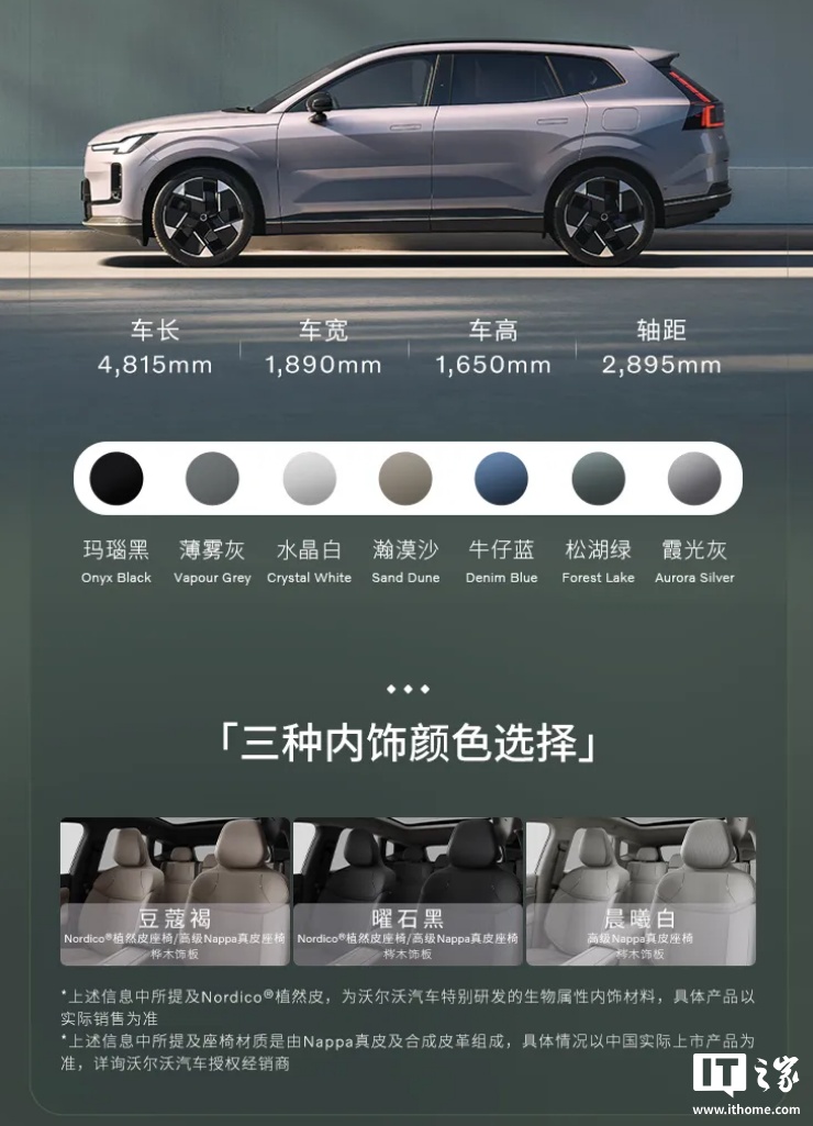 该车尺寸为 4815×1890×1650mm、轴距 2895mm,采用无框车门 + 隐藏式水切设计,提供霞光灰、松湖绿、瀚漠沙、牛仔蓝、水晶白、玛瑙黑、薄雾灰等自然车色。