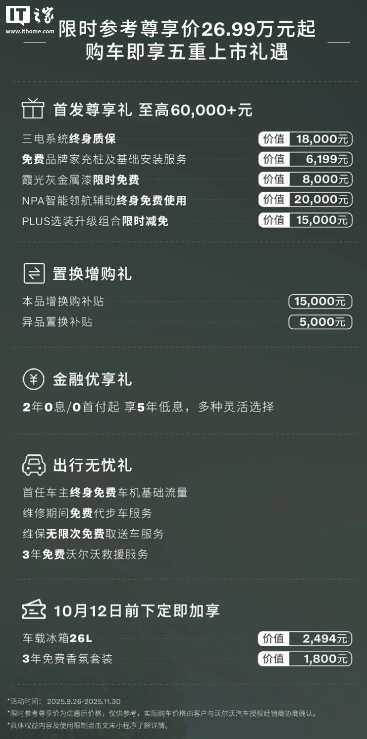 IT之家注:该车首发购车可享五重上市礼遇,包括限时增配 26L 车载冰箱、3 年免费香氛套装。