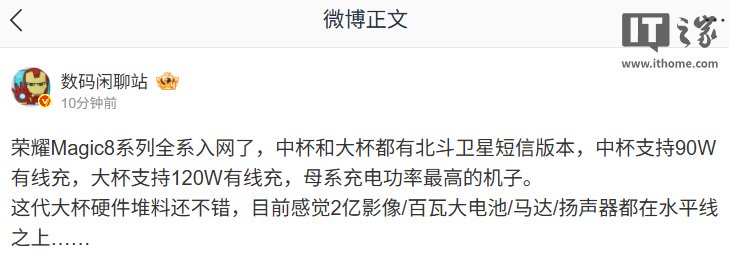 IT之家 9 月 27 日消息,博主 @数码闲聊站 今日发文称,荣耀 Magic8 系列全系入网了,中杯和大杯都有北斗卫星短信版本,中杯支持 90W 有线充,大杯支持 120W 有线充,母系充电功率最高的机子。此外,他还透露,这代大杯硬件堆料还不错,目前感觉 2 亿影像 / 百瓦大电池 / 马达 / 扬声器都在水平线之上。