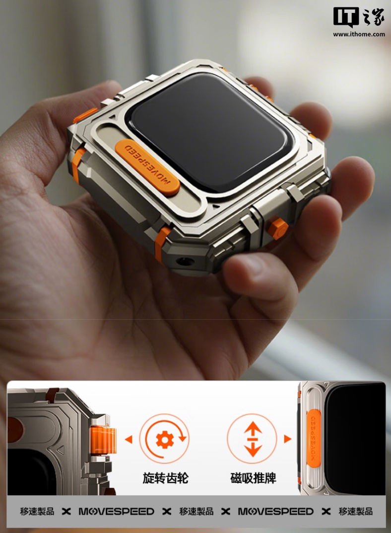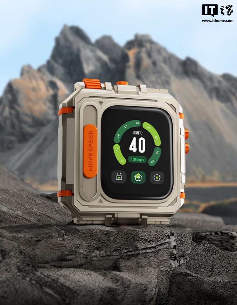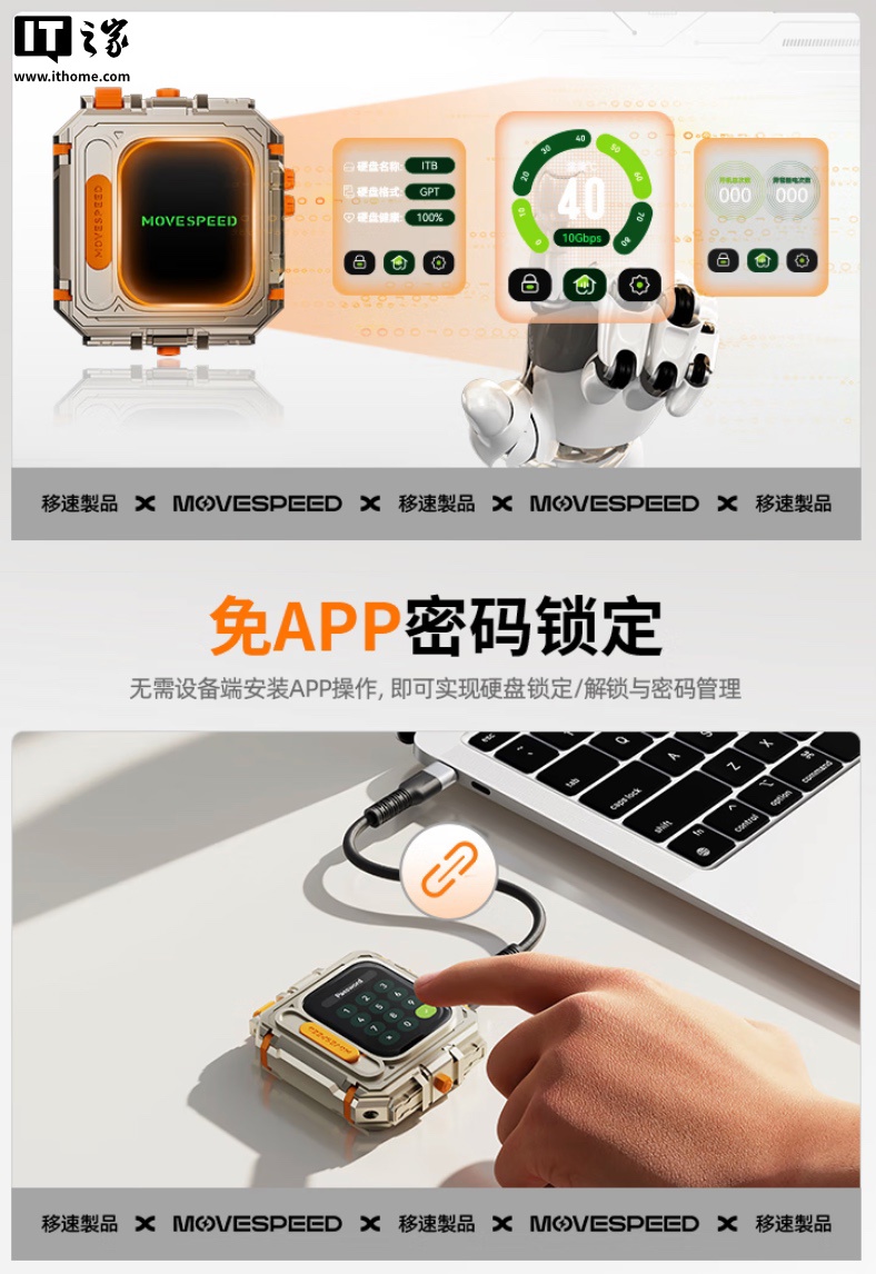 据介绍,该移动硬盘整体采用“赛博装甲”外观设计,尺寸为 71x63x20mm,提供旋转齿轮和磁吸推牌解压玩具设计,正面配备一块 1.83 英寸 240x284 分辨率面板,可以便捷管理硬盘加密,查看传输速度 / 断电次数等信息。