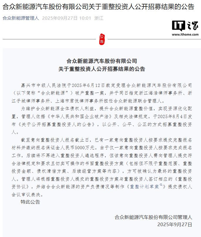 IT之家 9 月 27 日消息,合众新能源管理人(哪吒汽车母公司)今日发布《合众新能源汽车股份有限公司关于重整投资人公开招募结果的公告》。