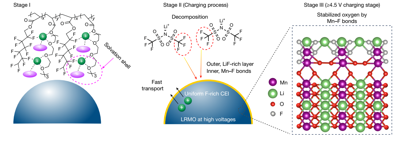 研究团队在聚醚电解质中引入强吸电子含氟基团,显著提升了其耐高压性能,使其可匹配 4.7 V 高电压富锂锰基正极,实现了单一电解质对高电压正极与金属锂负极的同步兼容。基于锂键化学原理,团队构建了独特的“–F∙∙∙Li⁺∙∙∙O–”配位结构,诱导形成具有高离子电导率的富阴离子溶剂化结构,进而在电极表面衍生出富含氟化物的稳定界面层,显著提升了界面稳定性。