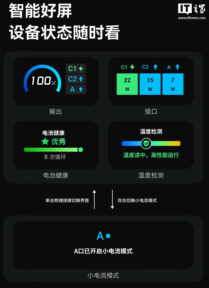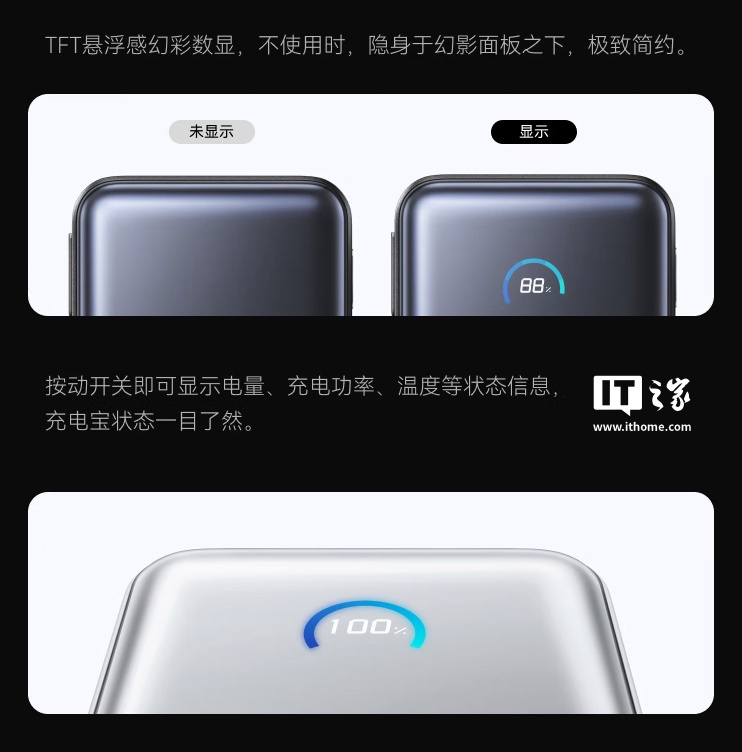 据介绍,这款移动电源尺寸为 50.5mmx81.5mm,整体重量为 230g,提供 TFT 隐藏式数显屏(可显示电量 / 充电功率 / 温度信息),匹配 70cm USB-C 伸缩线,其中 USB-C 线及 USB-C 接口均支持至高 45W 输出,而 USB-A 接口支持 22.5W 输出。