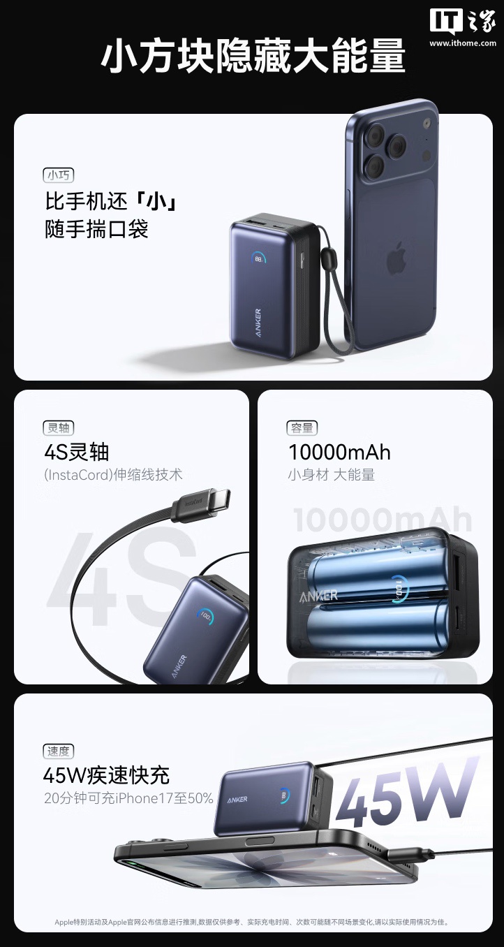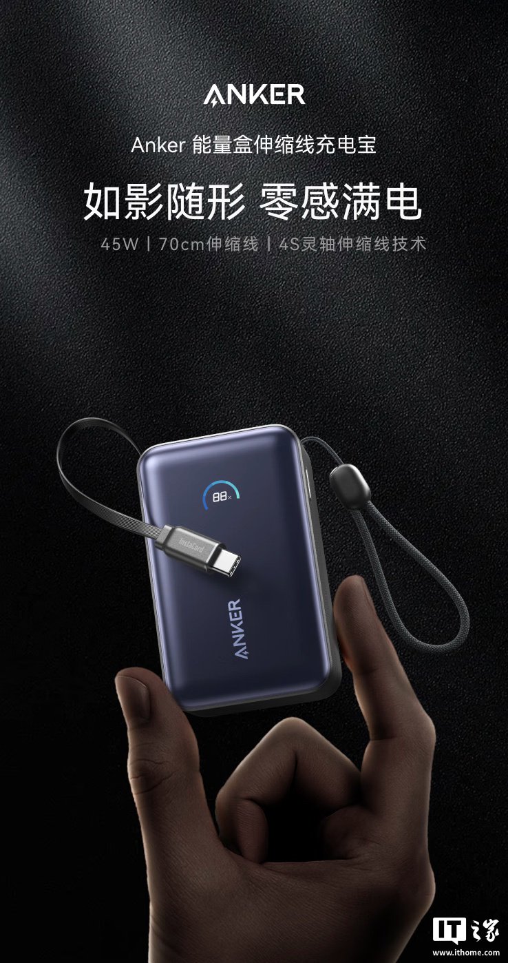 IT之家 9 月 27 日消息,安克现已在京东上架一款“安克能量盒”45W 带屏自带线移动电源,其采用 2C+1A 设计,内置 10000 毫安时电芯,定价为 289 元。